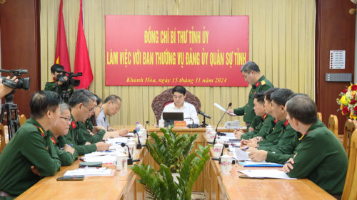 Đã đăng vào 15/11/2024 lúc 17:21Sáng 15/11, đồng chí Nghiêm Xuân Thành – Ủy viên Trung ương Đảng, Bí thư Tỉnh ủy Khánh Hòa đã có buổi làm việc với Ban Thường vụ Đảng ủy Quân sự tỉnh. Tại buổi làm việc, nhiều nội dung về công tác quân sự, quốc phòng và chuẩn bị Đại hội Đảng các cấp đã được báo cáo và thảo luận, hướng đến mục tiêu củng cố khu vực phòng thủ vững chắc, phát triển toàn diện lực lượng vũ trang trên địa bàn tỉnh.