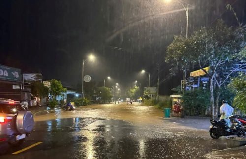 Nước từ các khu dân cư và sườn đồi hai bên đổ xuống mặt đường khiến nhiều đoạn ngập sâu từ 40–60cm, giao thông bị chia cắt, nhiều xe máy và ô tô nhỏ chết máy giữa đường.