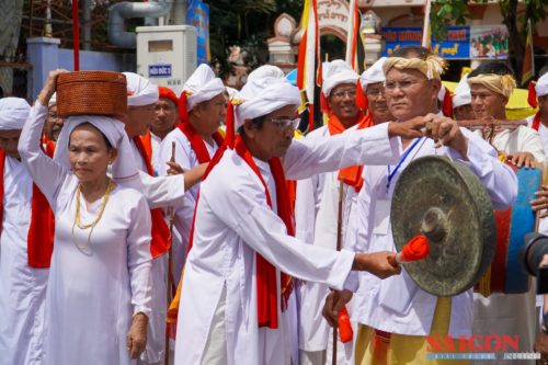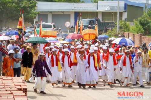 Đúng 13 giờ, sau hồi chiêng, trống báo hiệu, đoàn rước chính thức khởi hành. Dẫn đầu là các vị chức sắc Chăm theo đạo Bàlamôn. Tiếp đến là đội khiêng kiệu với cờ lọng