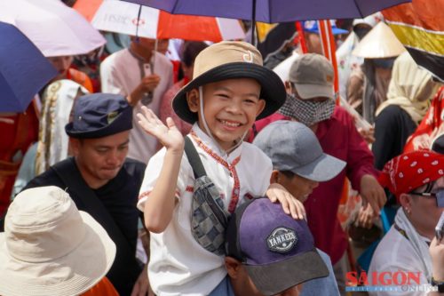 Đoàn người lớn, bé đi thành hàng dài phía sau. Tất cả di chuyển tới vị trí làm lễ đón rước y trang