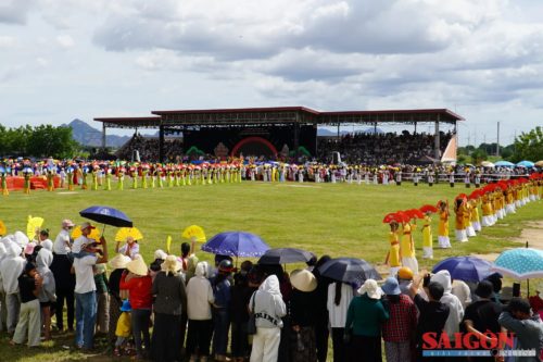 Đoàn rước vào đến sân vận động trung tâm và đồng diễn nghệ thuật Chăm, thu hút hàng ngàn người đến theo dõi. Ảnh: HIẾU GIANG